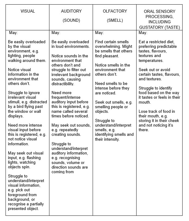 The sensory systems should work together in a coordinated way and most things that we do involve a number of sensory inputs being integrated. For the purpose of providing examples, the table below shows some of the possible challenges that can arise from sensory processing difficulties in each sense, though it should be noted that often more than one sensory system is involved.