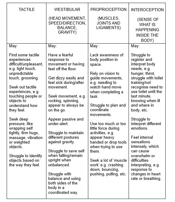Some examples of sensory based challenges are highlighted in the table below, but it is important to seek advice from a therapist trained in sensory integration if you are unsure about the sensory needs of your child. These needs are not always obvious and can appear inconsistent and unpredictable. For example, a child may struggle to cope in a noisy assembly but may thrive in a loud sports hall when playing their favourite sport.