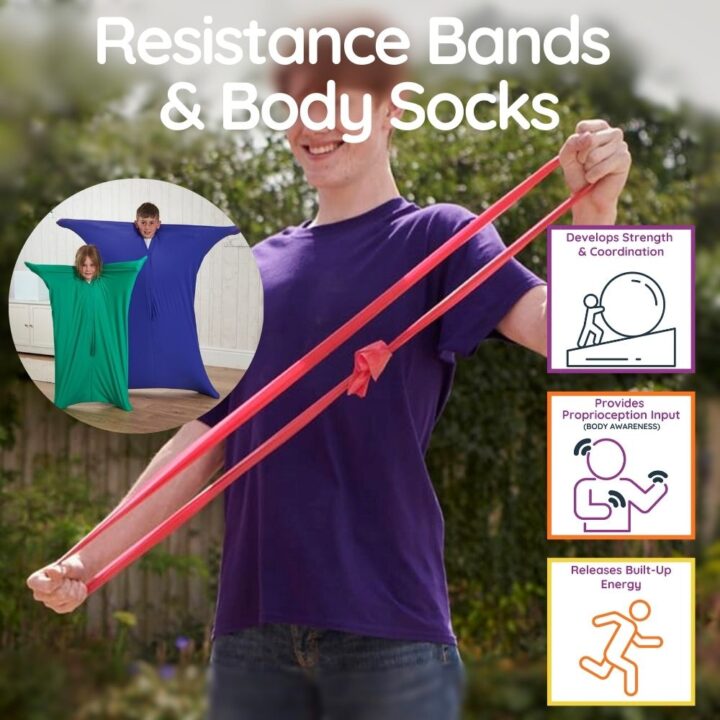 Resistance Bands and Body Socks are ideal for activities often referred to as “heavy work”, where muscles are actively working against resistance.